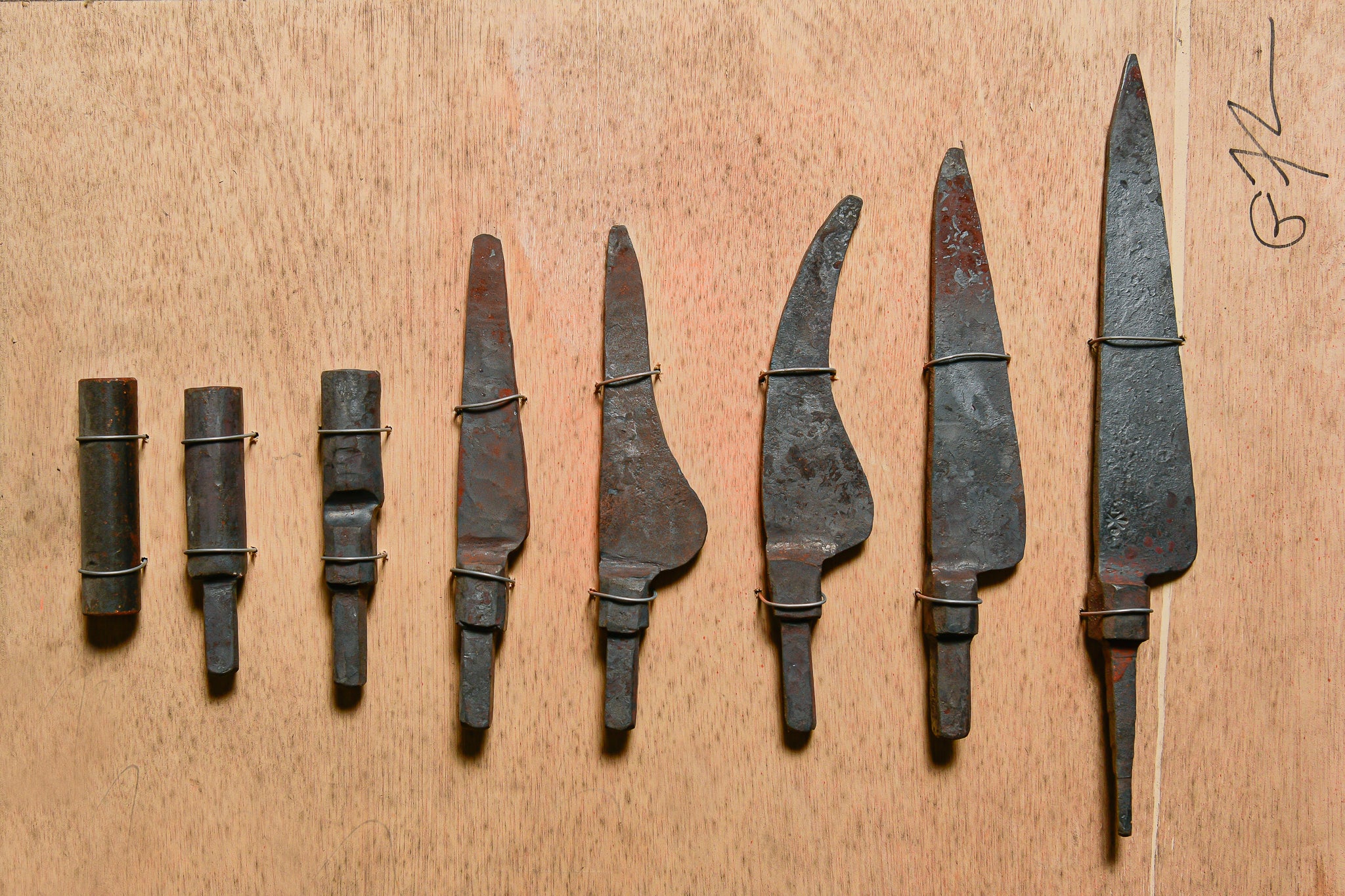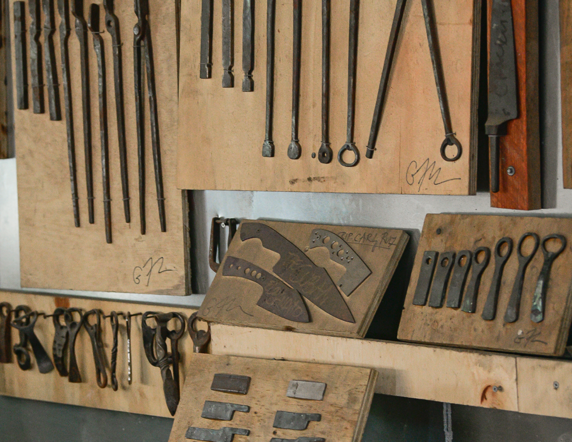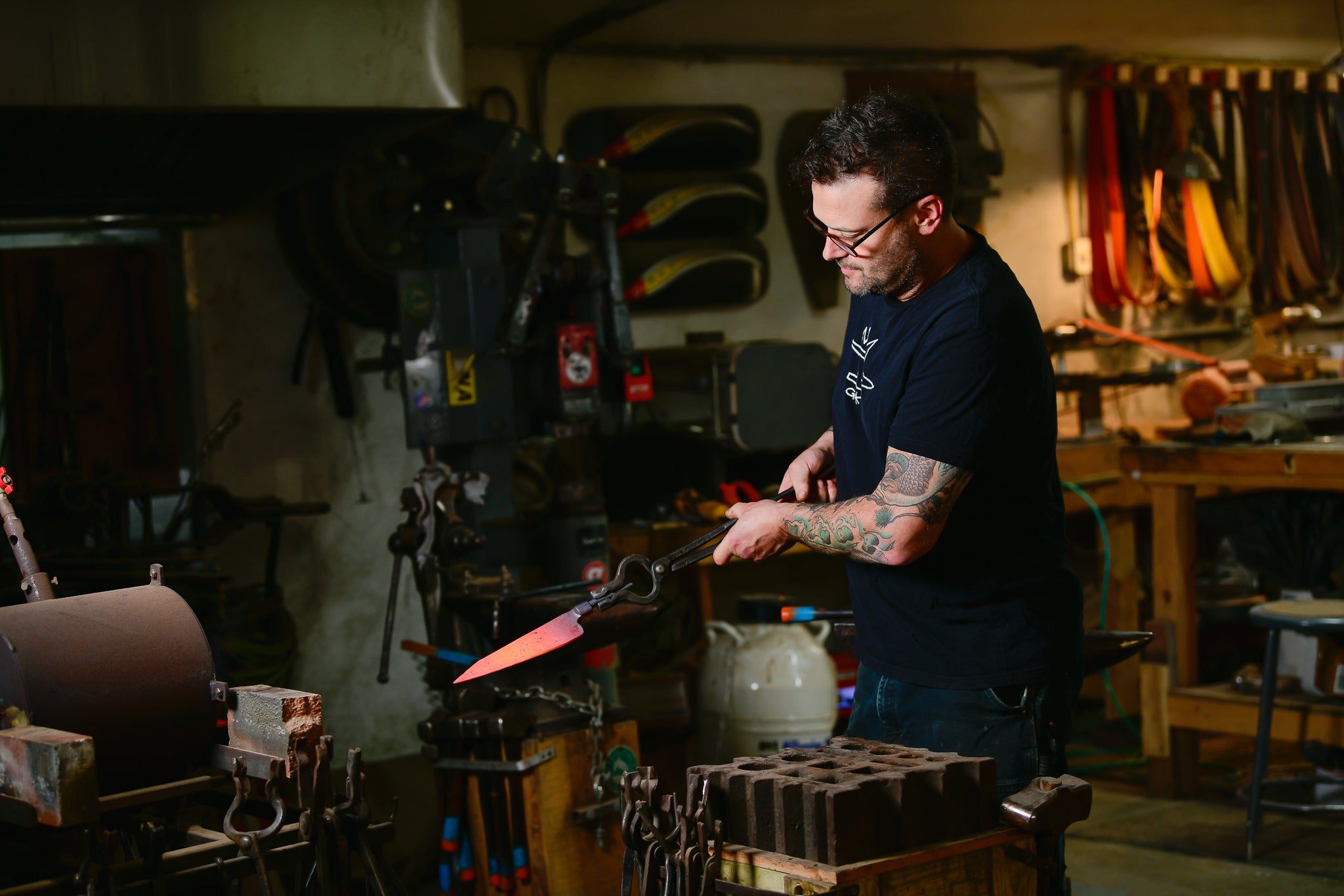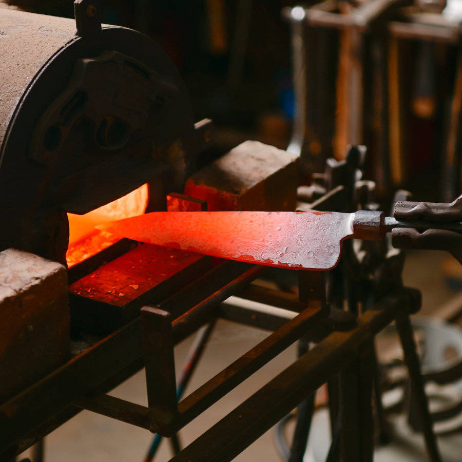 “Forging” is literally the process of ‘moving’ metal - as opposed to removing it by sawing, drilling or grinding as in the stock removal process. Hand hammered carbon steel is used to create the profile of the knife. Both full and hidden tang knifes are available utilizing this technique as well as and integral style knives.