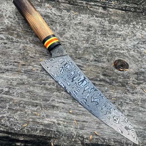 High carbon and high nickel steels are forged welded together to create dynamic patterns by folding and twisting the metals together. At the end of the knife making process the knife is dipped into ferric chloride acid which etched the high carbon steel and leaves the high nickel steel alone which makes the pattern visible.