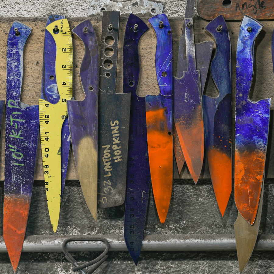 We develop a design and profile of a knife by first drawing a blueprint of it. We then trace a pattern on a stick of steel and cut out using band saw. We then heat treat the steel grind to the proper profile. Here we use either stainless steel or high carbon steel to make either a full tang or hidden tang style knife.