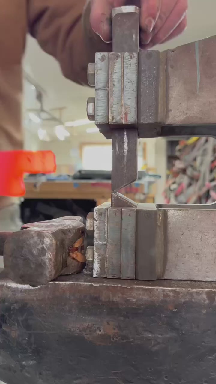 This Integral Chef knife is forged out of a 1” round bar approximately 4” long, and it’s called an Integral Chef Knife because the blade flows out of the bolster of the knife transitioning into the handle. This particular style of knife highlights blacksmithing as a true manipulation of the mass. The steel is heated to a temperature so that it's malleable like clay. However, unlike clay, where you can use your hands to pinch, stretch, and move the material, the steel is too hot to touch, so a hammer and anvil technique is applied to move the steel while in this plastic-like state.